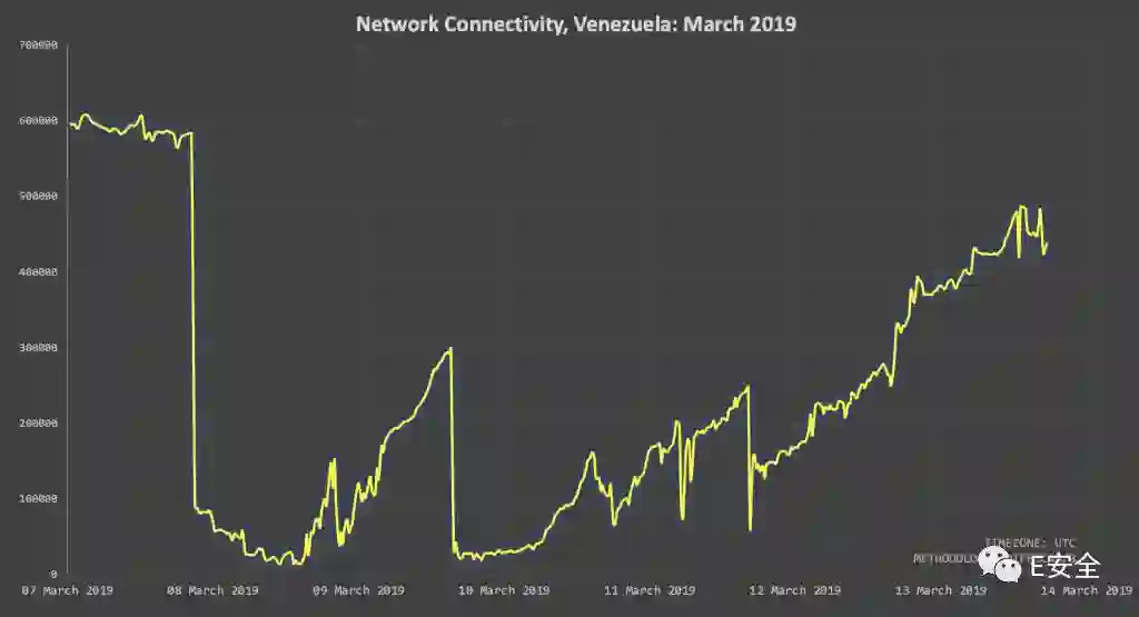 下图是大停电事件发生后7天,委内瑞拉发生的数次断电的电力走势图(来源:Netblocks)