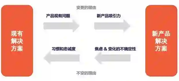 从现有的解决方案到新产品的转变,影响用户做出决策的有 4 个因素。