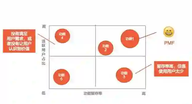 在上面这张图中,第一象限的功能,功能留存率和活跃用户占比都比较高,说明这是产品的核心功能,已经达到 PMF(Product Market Fit);