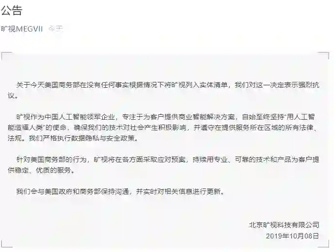 北京旷视科技有限公司公告称, 关于今天美国商务部在没有任何事实根据情况下将旷视列入实体清单,我们对这一决定表示强烈抗议。