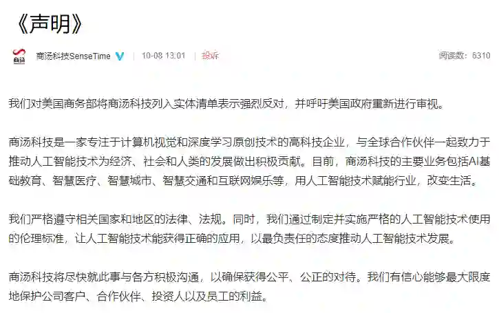 商汤科技在官微声明称,对美国商务部将商汤科技列入实体清单表示强烈反对,并呼吁美国政府重新进行审视。
