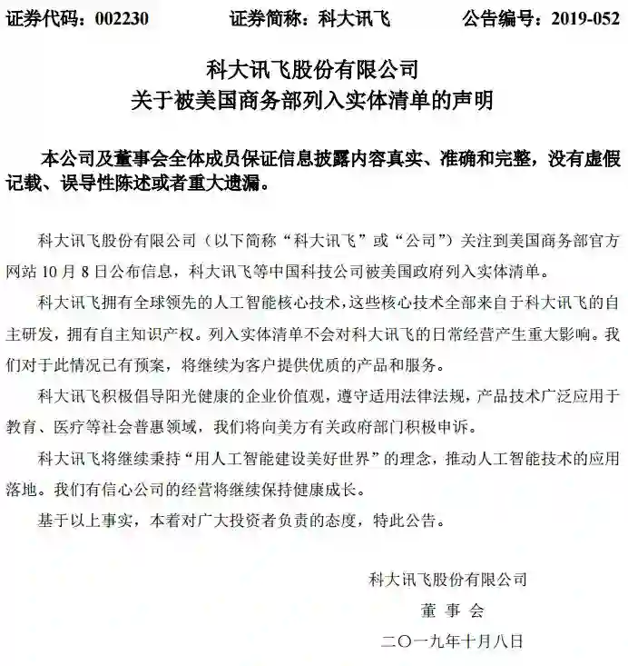2、科大讯飞:列入实体清单不会对日常经营产生重大影响