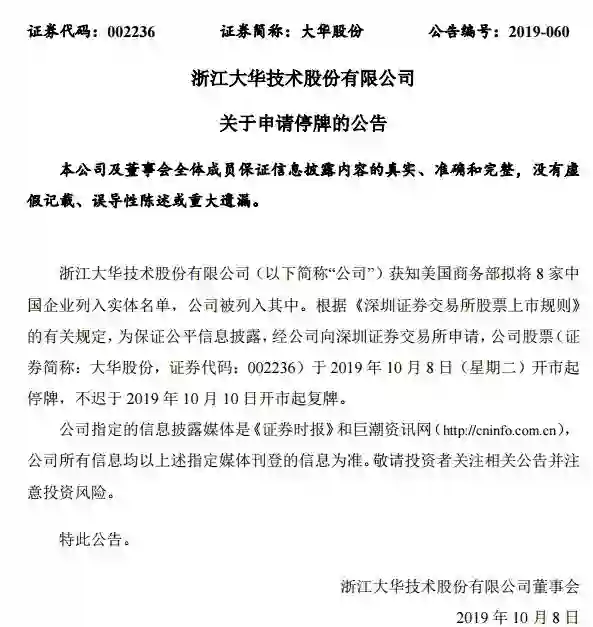 其中,大华股份不迟于2019年10月10日开市起复牌,海康威视则公告称于 2019 年 10 月 10 日开市起复牌。