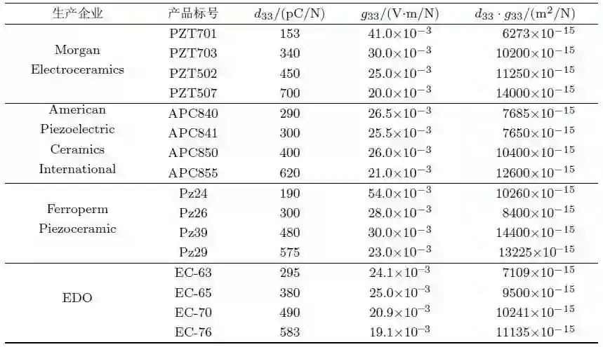表1 不同商用压电陶瓷材料的压电性能参数和机电转换系数