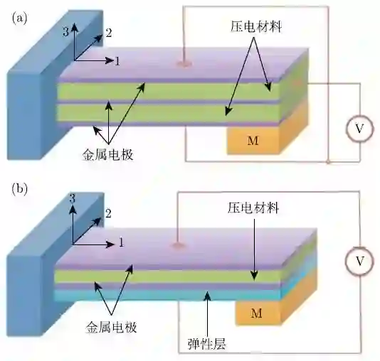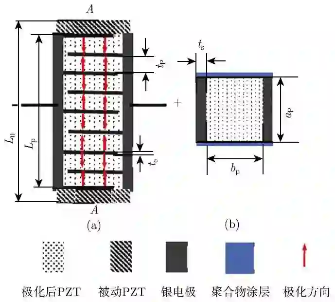 目前,压电能量收集器的设计结构通常分为悬臂梁结构和多层叠堆结构。图2 (a) 和(b) 分别为压电双晶片和压电单晶片悬臂梁结构示意图。在这类悬臂梁结构中,悬臂梁一端固定,另一端随环境中的机械振动做周期运动。环境中的振动能首先转换成图2 中质量块M 的动能,然后质量块M 的动能转变成悬臂梁结构的弹性势能,压电层中变化的应变产生交变电压,并通过压电层的电极输出。这种悬臂梁结构的压电能量收集器一般为31-模式,外加应力沿轴向,产生电压的方向与其垂直。需要说明的是,当前的微加工技术很难在MEMS尺度制作压电双晶片结构,因此,MEMS 悬臂梁压电能量收集器通常设计并制作成单晶片结构。图3 为另一类压电叠堆能量收集器结构示意图。压电叠堆结构与多层陶瓷电容器(MLCC) 类似,内电极交替排列。这种压电能量收集器为33-模式,即外加应力的方向与产生电压的方向一致。两种工作模式(31-模式和33-模式) 中压电材料都可以产生电能。由于31-模式在较小的输入力作用下可以产生较大的应变,且共振频率也比较低,因此,31-模式更适合低频机电能量转换。