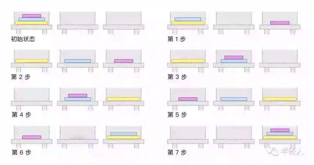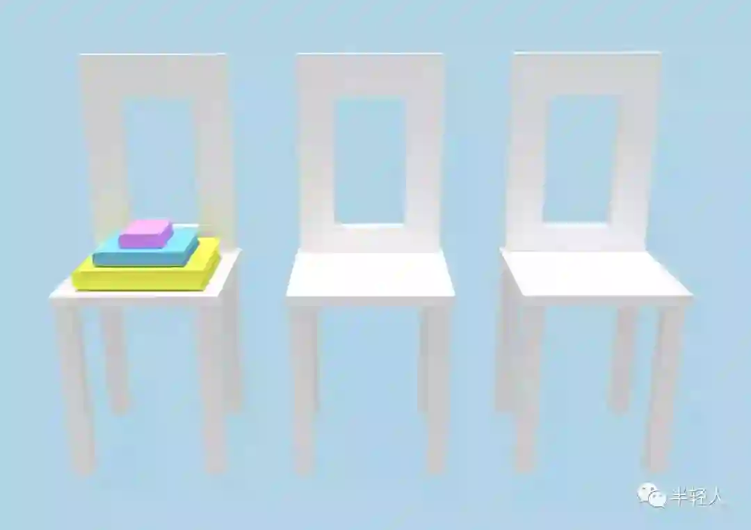 游戏目标是把第一把椅子上的三本书(或四本书,五本书,六本书……)全部搬运到第三把椅子上。
