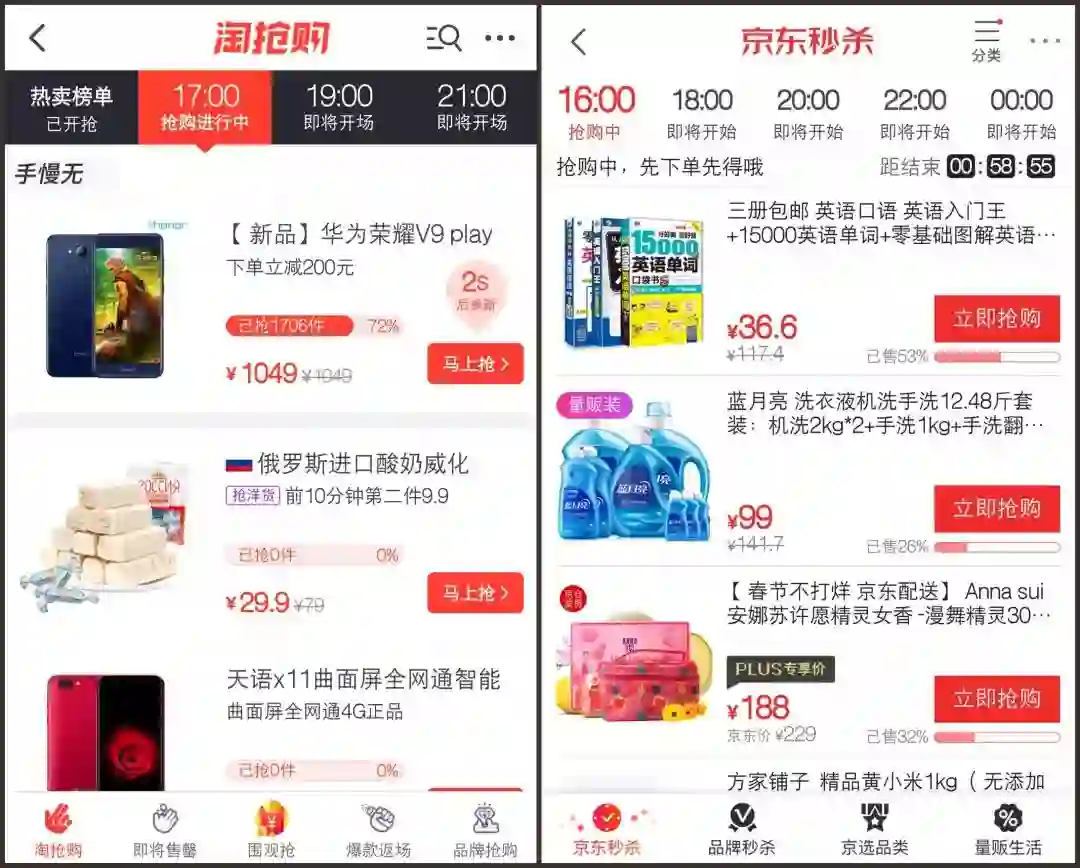 淘宝的“淘抢购“、京东的”京东秒杀”在产品的构思上都运用了这一原理,商品只售卖2个小时,显示剩余的库存数量,再加上“马上抢”、“手慢无”等字样营造活动的紧张感,商详页再次提醒截止时间、剩余库存等信息刺激用户快速下单。