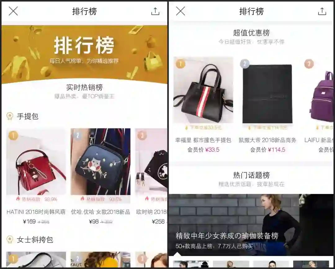 唯品会的“排行榜”产品,就是通过系统拉取各个类目的热销商品列成榜单,给没有明确购买需求的用户推荐平台的热卖商品;用户通过榜单,可以了解到平台人气产品是哪些,大家都在买什么,哪些商品比较值得信赖。