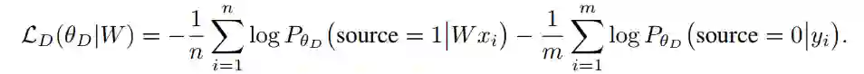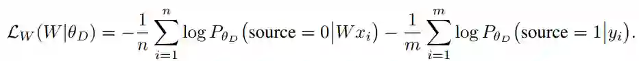 本文首先使用了领域-对抗生成(domain-adversarial)的方法来学习语言对之间的线性映射参数,判别器(Discriminator)目标在于判别向量来自于目标语言还是源语言映射,其目标函数如下: