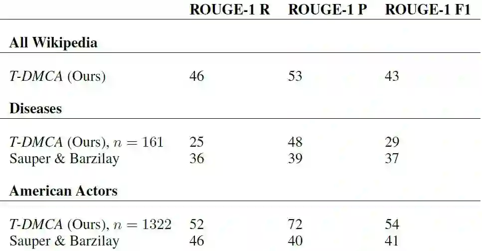 表 7:与 Sauper 和 Barzilay(2009)的论文中的结果比较。请注意,谷歌大脑这篇论文中的的结果是维基百科主要部分的报告,而 Sauper 和 Barzilay 的是文章的报告。