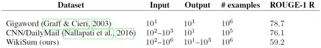 表 2:WikiSum 数据集不同属性的百分比,大小以单词数量为单位。