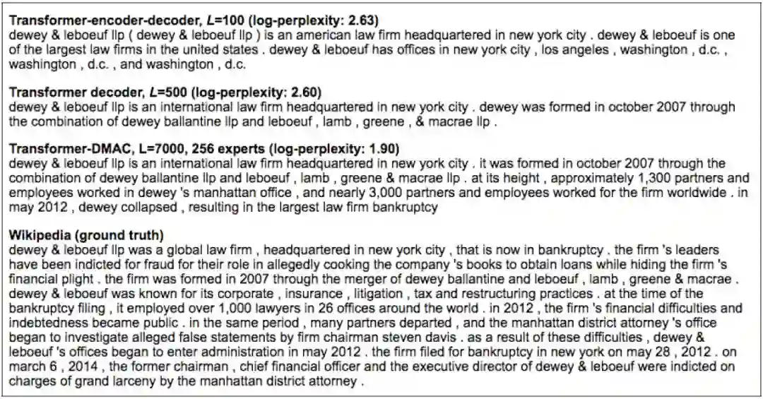 图 4 展示了三个不同模型(使用 tf-idf 提取和组合语料库)的预测结果和维基百科原文本(输入样本)。随着复杂度的降低,我们可以看到模型输出在流畅性、事实准确性和叙述复杂性方面有所改善。特别是,T-DMCA 模型提供了维基百科版本的一个可替代性选择,并且更为简洁,同时提到了关键事实,例如律师事务所的位置、成立方式和时间以及企业的兴衰。