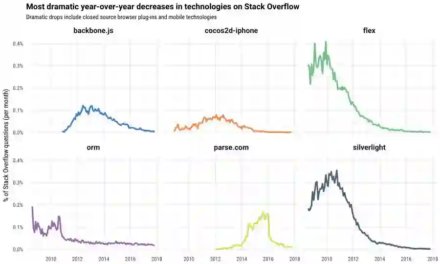 上周从极客时间上看到了一组 Stack Overflow 的分析数据,分别揭示了增长势头最为明显的技术、急转直下的技术和稳步增长的技术。分析数据是根据 Stack Overflow 的提问标签进行统计的。