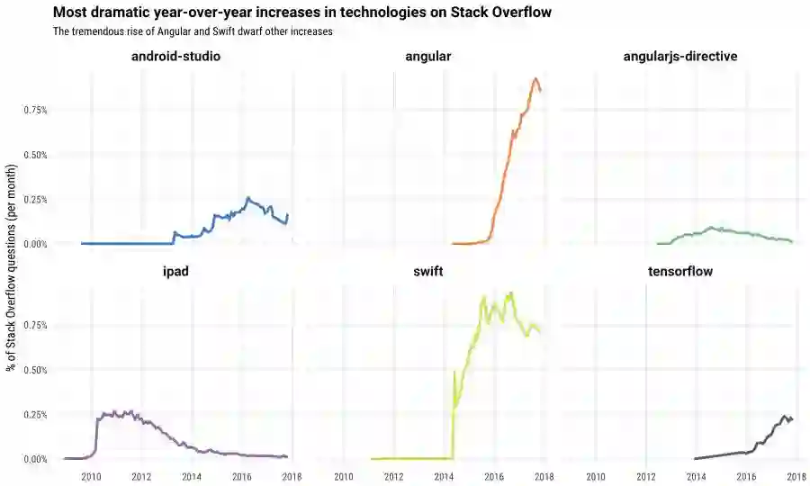 比如增长最明显的技术有 Swift 和 Angular,从2015年开始这两个技术都出现了陡峭的直线增长,Swift 背后推手是苹果,iOS 在突飞猛进,其官方语言也不会差到哪去,Angular 则引领了前端框架的变革。Android Studio 是谷歌推出的开发 IDE,增长势头也很快。iPad 在2010年发布的时候也有过类似的增长曲线,不过现在相关的提问已经很少了。在 AI 大行其道的今天,TensorFlow 几乎成为了机器学习和深度神经网络的工业标准,涨势喜人。