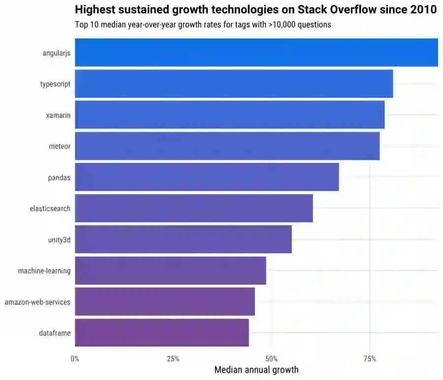 有哪些稳步增长的技术呢?当然是前端大丰收了,Angular 居首,JavaScript 的生态系统成员 TypeScript 和 Meteor 紧随其后。Pandas 是 Python 的一个开源数据分析库,它提供的数据结构DataFrame 极大的简化了数据分析过程中一些繁琐操作,由于数据科学和机器学习的风生水起,Pandas 同样水涨船高。其他一些技术则在行业内有广泛的应用,比如搜索引擎 Elasticsearch,游戏引擎 Unity,亚马逊的 Web Service 服务,机器学习框架等等。