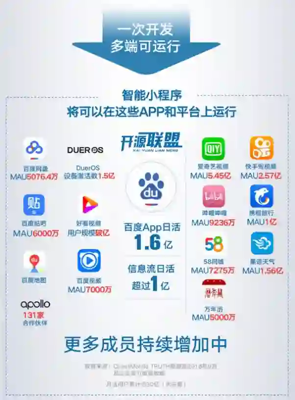 作为联盟的发起人的百度平台而言,百度智能小程序平台在赋能APP、开发者的同时,也将吸引更多的同业者共同做大蛋糕,不断提升流量规模和技术优势,吸引越来越多的用户沉淀其中,供养整个开源生态。而百度也将在这样的正循环中,成为不可或缺生态基础。