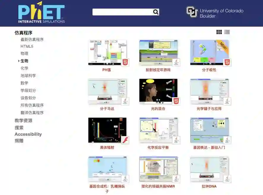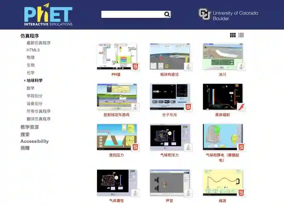 PhET包含从小学到大学的数学、物理、化学、生物、地球科学的在线互动演示课程: