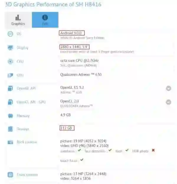 据媒体报道,日前,型号为H8416的神秘索尼新机曝光在GFXBench上,该机可能是代号(Akatsuki/晓)的Xperia新机。从图中可以看到,新机预装了安卓9.0系统,并且搭载了索尼手机史上首次的2K屏幕——即分辨率为2880×1440的屏幕,尽管索尼用过4K屏,但用2K屏幕还是头一次。另外屏幕大小为5.9英寸,比索尼Xperia XZ2的5.8英寸稍大一些。值得一提的是,该机搭载了6+128GB的存储组合,在索尼手机上也是首次。不过该手机只有一颗1900万像素主摄像头。
