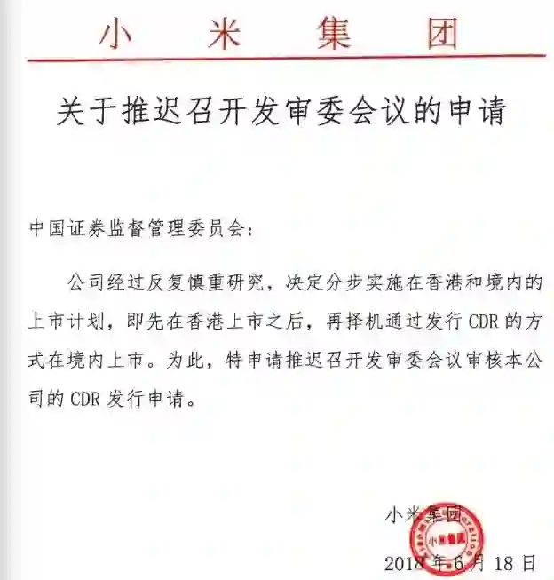 而后,小米官方微博今日早间称,公司经过反复慎重研究,决定分步实施在香港和境内的上市计划,即先在香港上市之后,再择机通过发行CDR的方式在境内上市。为此,公司向中国证券监督管理委员会发起申请,推迟召开发审委会议审核本公司的CDR发行申请。