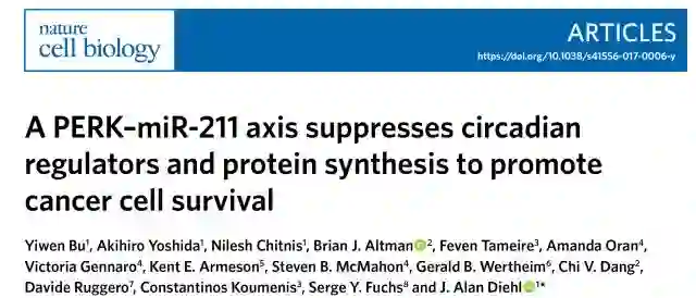 参考文献:Yiwen Bu, Akihiro Yoshida, Nilesh Chitnis, Brian J. Altman , Feven Tameire, Amanda Oran,Victoria Gennaro, Kent E. Armeson, Steven B. McMahon, Gerald B. Wertheim, Chi V. Dang,Alan Diehl. A PERK–miR-211 axis suppresses circadian regulators and protein synthesis to promote cancer cell survival.https://doi.org/10.1038/s41556-017-0006-y
