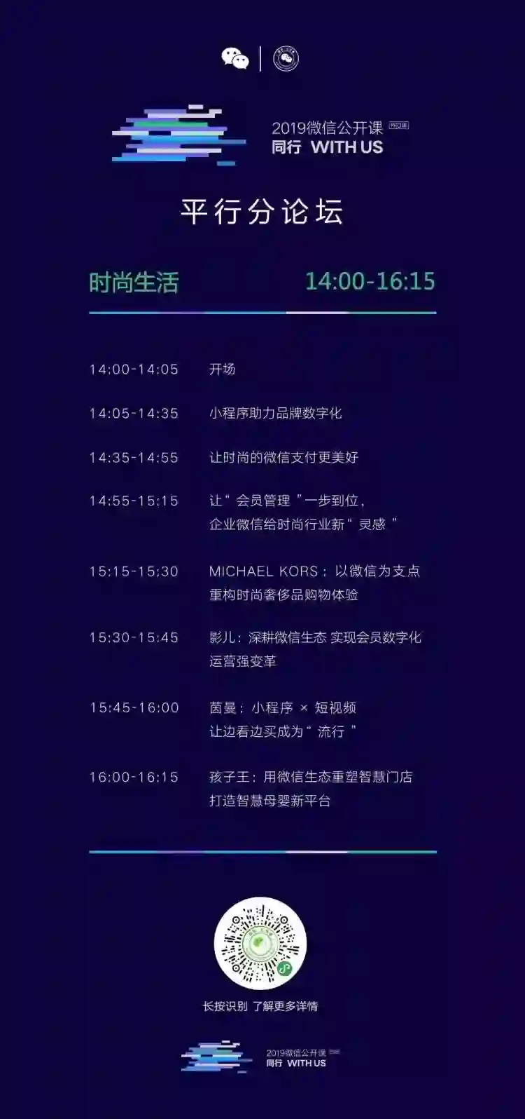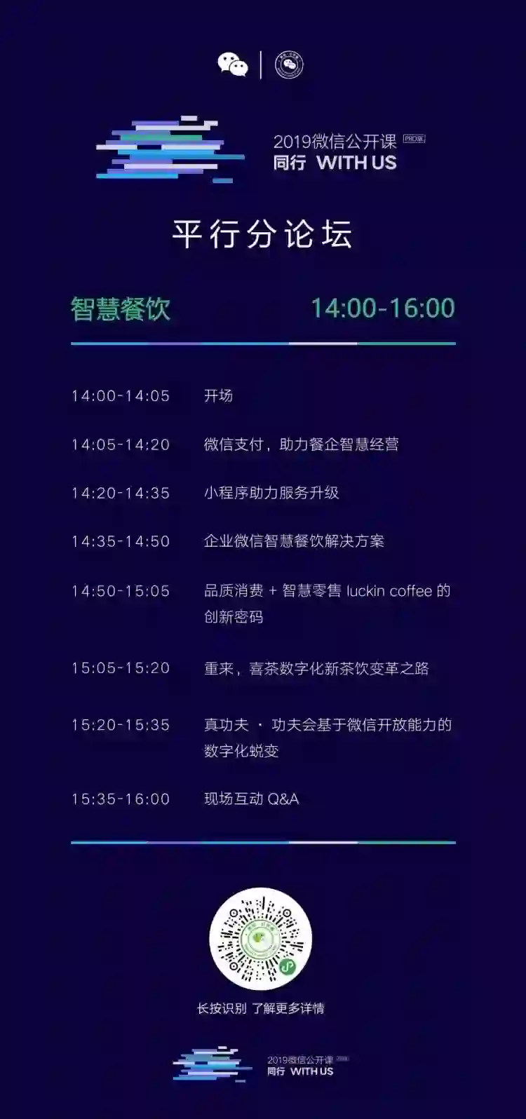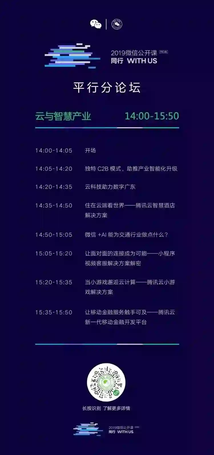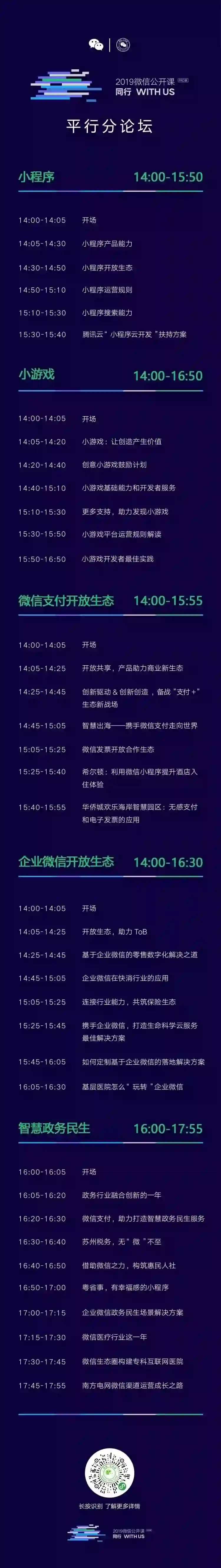 下午共有五场平行分论坛,围绕小程序、小游戏、微信支付开放生态、企业微信开放生态和智慧政务民生分别展开,让你all in微信产品与生态的知识点。