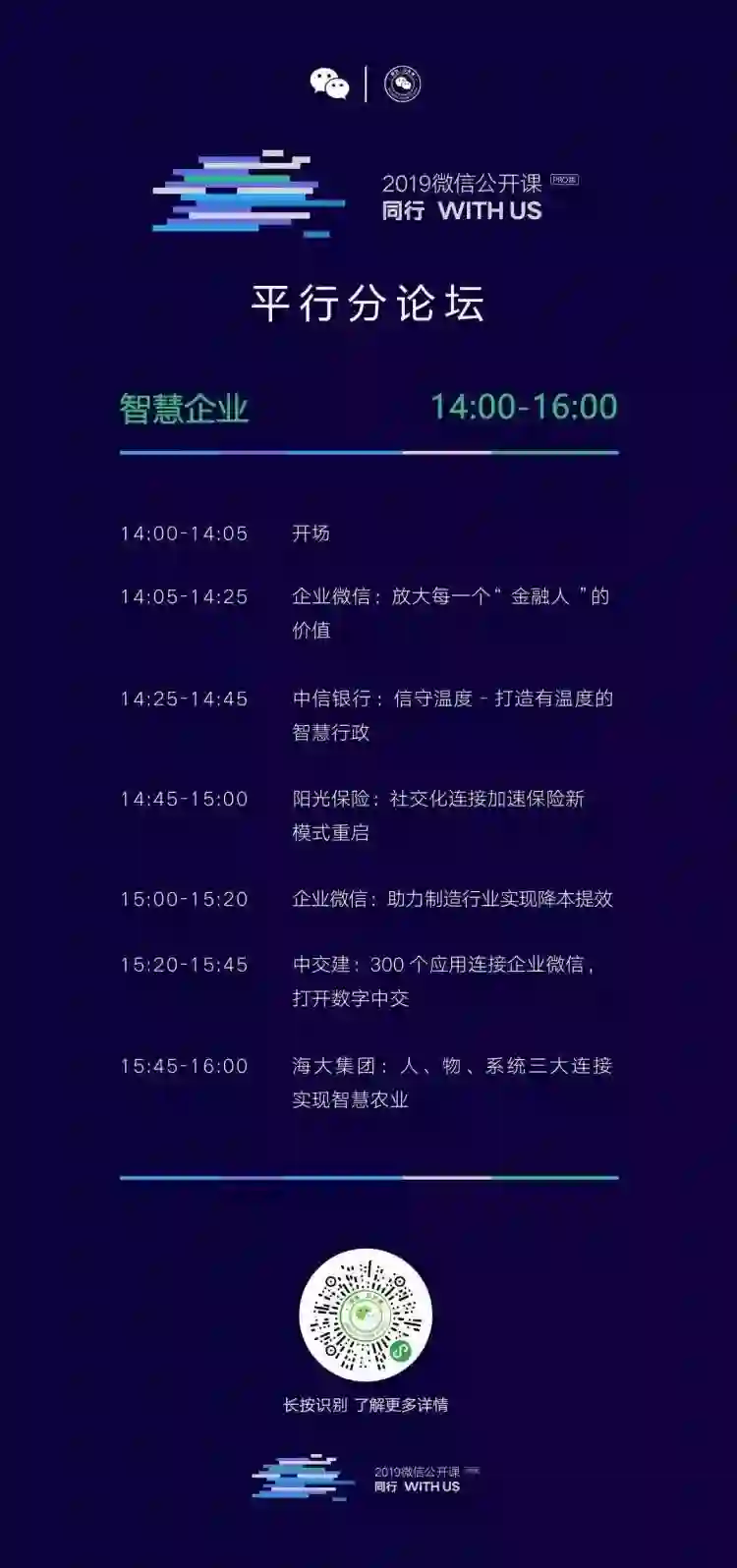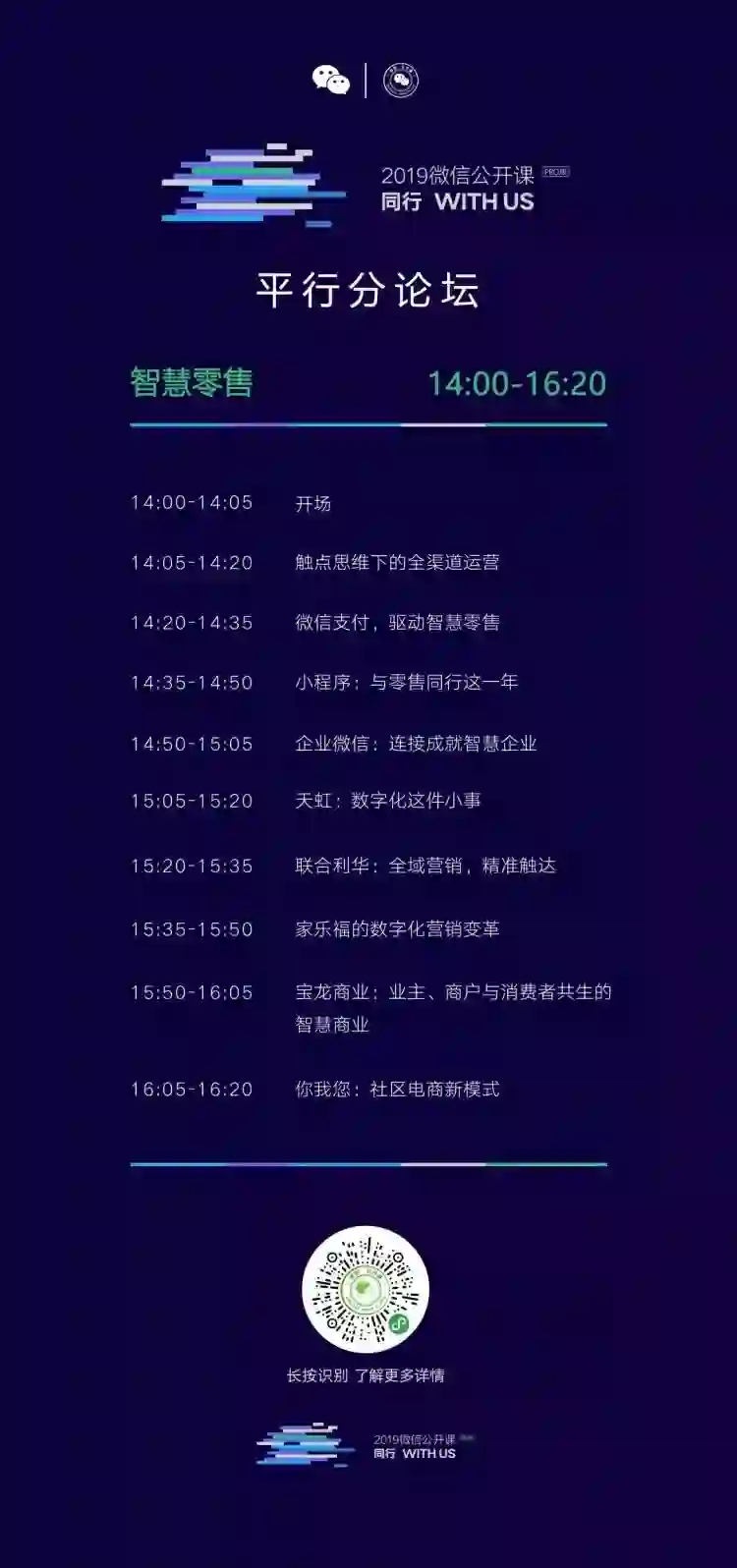 在下午的八场平行分论坛上,微信智慧家族将首次集结亮相,全方位阐释智慧零售、智慧餐饮、智慧出行、智慧教育、时尚生活、云与智慧产业、微信广告、智慧企业八大赛道产业互联网时代的智慧趋势。