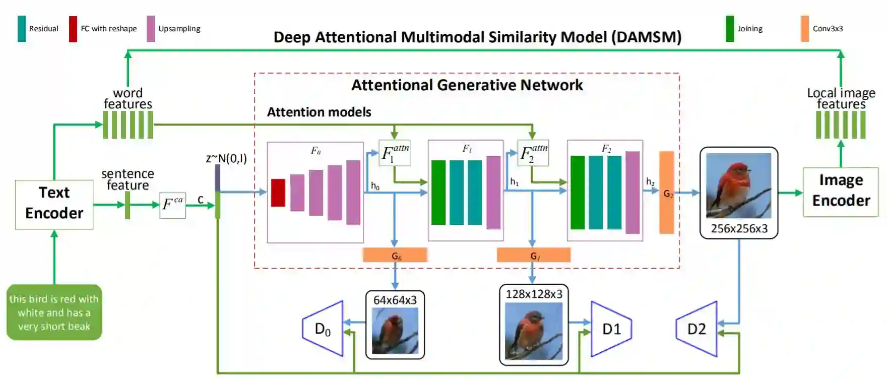 该模型还从训练数据中学习到了人类称为常识的东西,并且利用这个学习的概念来填充留在想象中图像的细节。例如,由于训练数据中的许多鸟类图像中,鸟都是坐在树枝上的, AttnGAN 生成的图像里鸟也就栖息在树枝上,除非文本另有规定。