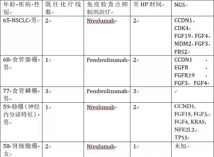 结果:5例患者评价为HP,4例(80%)患者的NGS结果可知。最常见的体细胞突变为MDM2/MDM4扩增(50%),EGFR扩增(25%)和委员染色体11q13-CCND1,FGF3,FGF4和FGF19(75%)的一些基因扩增。通过分析本中心的分子检测数据库(N=696),结果显示MDM2/MDM4,EGFR和11q13扩增的患者分别为26例(4%),26例(4%)和256例(4%)。在70例合并有这些基因变异的患者中,10例接受了免疫检查点抑制剂治疗,其中,MDM2/MDM4,EGFR和11q3扩增的患者,发生HP的患者各有2例(66%),1例(50%)和3例(43%)。患者的详细临床特征总结如下。