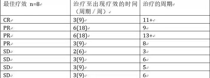 结果:研究入组24例患者,22例为喉癌(OPC),口腔癌和宫颈癌各1例。18例(75%)的患者既往在接受铂类治疗后6个月内进展,1例患者既往未接受过铂类治疗。12例(50%)的患者接受过西妥昔单抗治疗。复发后一线治疗的患者10例(10/24),二线治疗的患者14例(14/24)。ORR为33%(8/24):1例CR,7例PR(其中1例未确认),3例(13%)SD,13例(54%)PD。在OPC患者中,ORR为36%(8/22)。8例PR的患者中,6例既往接受铂类治疗后6个月内进展。中位的疗效持续时间为30.1+周(6-49+周);8例PR的患者中,5例仍持续缓解。中位的无进展生存期为2.7个月(95%CI:2.3-8.0)。6个月的PFS率为33%(16-52%);6个月的OS率为74%(51-87%)。毒性:3度转氨酶升高和4度血脂升高的患者各1例;1-2度毒性:发热(5例),注射部位反应(6例),出现转氨酶升高,乏力和恶心的患者各有3例。