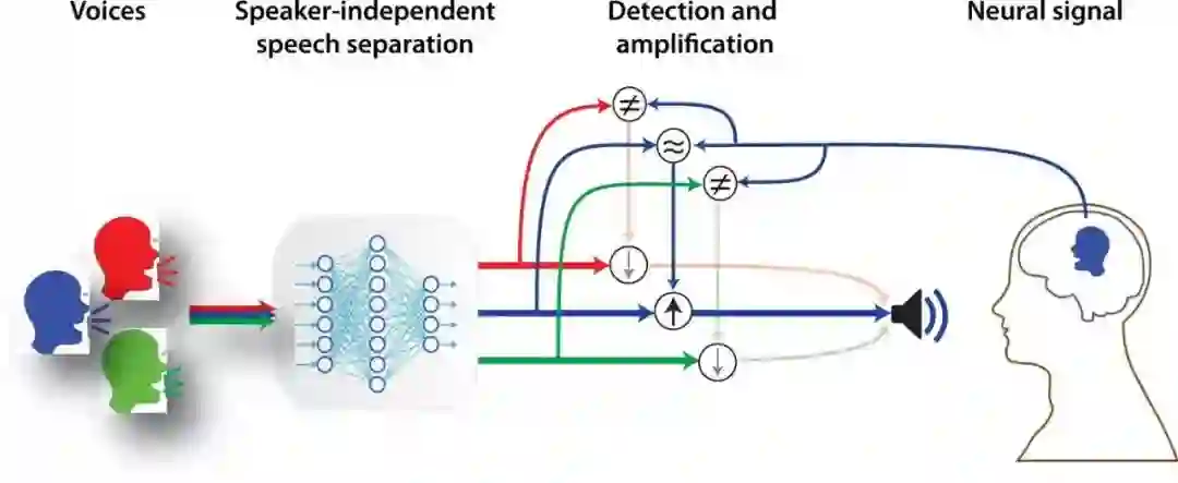 哥伦比亚大学 Mortimer B. Zuckerman Mind Brain Behavior Institute 研究员、该论文作者 Nima Mesgarani 博士说,他们发现两个人在交谈的时候,说话的人的脑电波与听者的脑电波会逐渐趋同。于是团队将语音分离算法与神经网络、及模仿大脑自然计算能力的数学模型相结合,开发了一款脑控助听器,使用脑电波来判断哪些声音是需要被放大的 “重点声音”,哪些声音是噪音。
