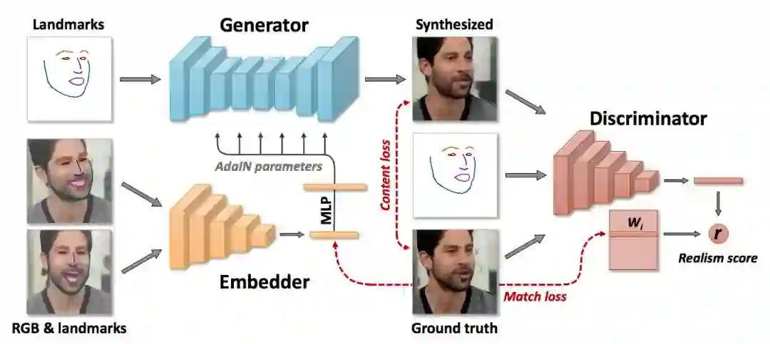 这篇论文里谈到的技术就只需要几张、甚至一张图就能生成真实可信的动图。机器先集中看很多视频、在海量视频数据集上执行冗长的元学习,之后通过功能强大的生成器(generator) 及 鉴别器(discriminator),它就能把少数几张图片、或单张图片变成动图。