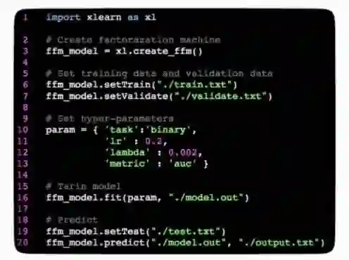 (3)易用性和灵活性,xLearn 提供简单的 python 接口,并且集合了机器学习比赛中许多有用的功能,例如:cross-validation,early-stopping 等。除此之外,用户可以灵活选择优化算法(例如,SGD,AdaGrad, FTRL 等)