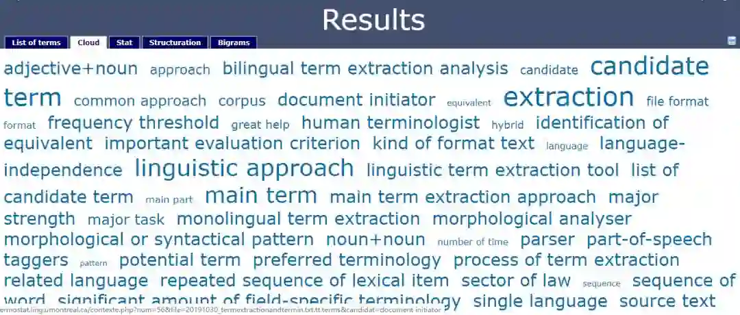 TermoStat 是一款术语抽取工具,应用了语言学法和统计学法,同时还会考虑潜在术语的结构和相对的出现频率。TermoStat免费开放,但用户需要注册才能使用。