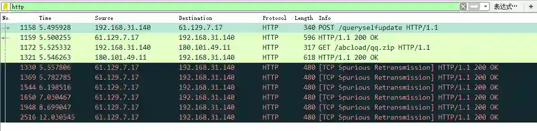 需要说明的是,该URL“www.baidu.com/abcload/qq.zip ”事实上是无效地址,但在被劫持的现场中,对该地址的HTTP GET请求会收到相应的响应包,并且会下载到包含病毒的qq.zip压缩包。