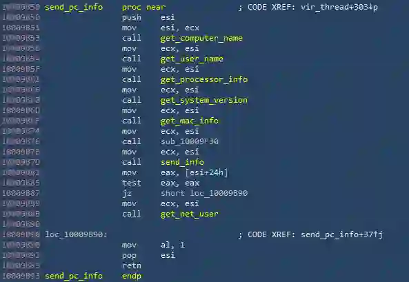 解压包qq.zip中存放有病毒程序“txupd.exe”,图标是MFC默认图标,和腾讯升级程序图标有明显不同,经火绒工程师分析,该病毒为后门病毒,会收集用户计算机名称、账户名称、处理器信息、系统版本、MAC地址等信息上传到C&C服务器作为主机标识,且具备抓取屏幕截图、执行远程命令等功能。
