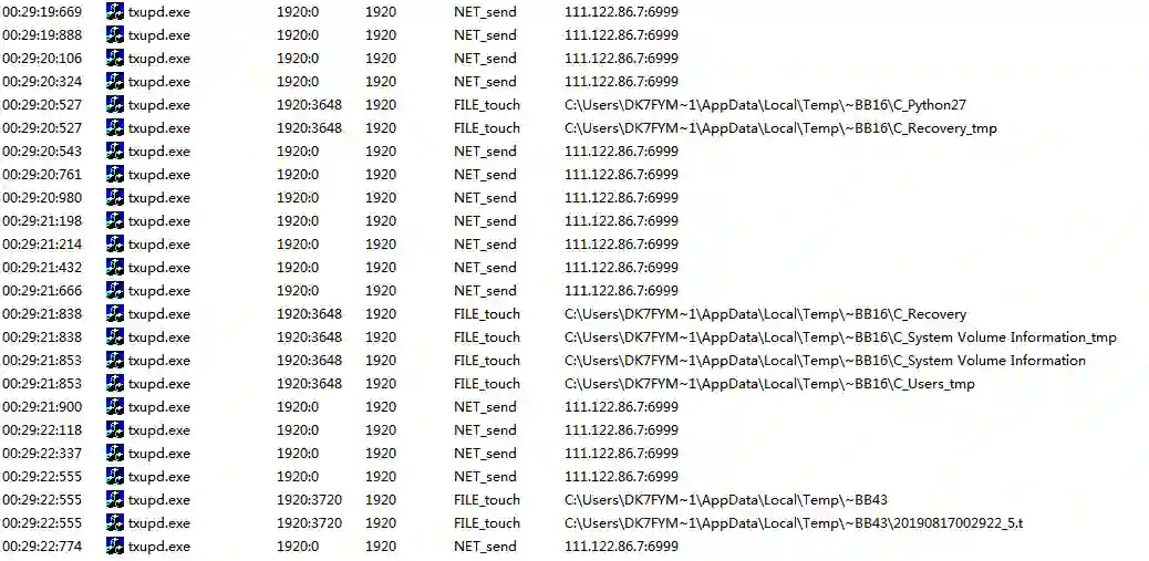 使用火绒剑监控下载到的病毒程序“txupd.exe”会向多个C&C服务器(111.122.86.7、111.120.23.23等)回传获得的用户数据,如下图所示: