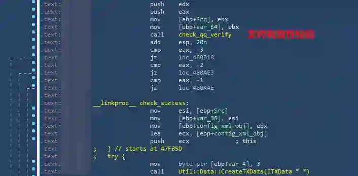 升级程序主要逻辑是:首先将本地QQ软件信息发送到QQ升级服务器,之后根据服务器返回的XML数据下载更新txupd.exe。在早期版本QQ升级程序中,由于下发升级XML数据校验代码中存在漏洞,在2015年版本中已经进行了相应修补,但修复后的升级程序中依然存在逻辑漏洞。QQ升级程序中仅有一处升级内容校验,校验完成后,会下载指定网址中的压缩包,之后验证压缩包MD5,解压执行压缩包中的txupd.exe。相关代码,如下图所示: