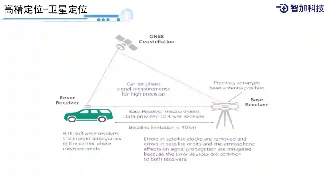 卫星定位算法的原理是:在车辆行驶的某一位置,可以接受到各个卫星的信号,通过对该位置和各个卫星之间距离的解算,就可以得到该位置的坐标。但是,在收集卫星信号的过程中,会受到电离层和对流层的影响,产生时延等误差,导致米级别的定位误差。为了将误差缩小,需要利用RTK载波相位差分技术进行定位修正,即通过寻找离当前位置较近的、已知精确位置基站,通过接受基站数据,对卫星数据进行修正。