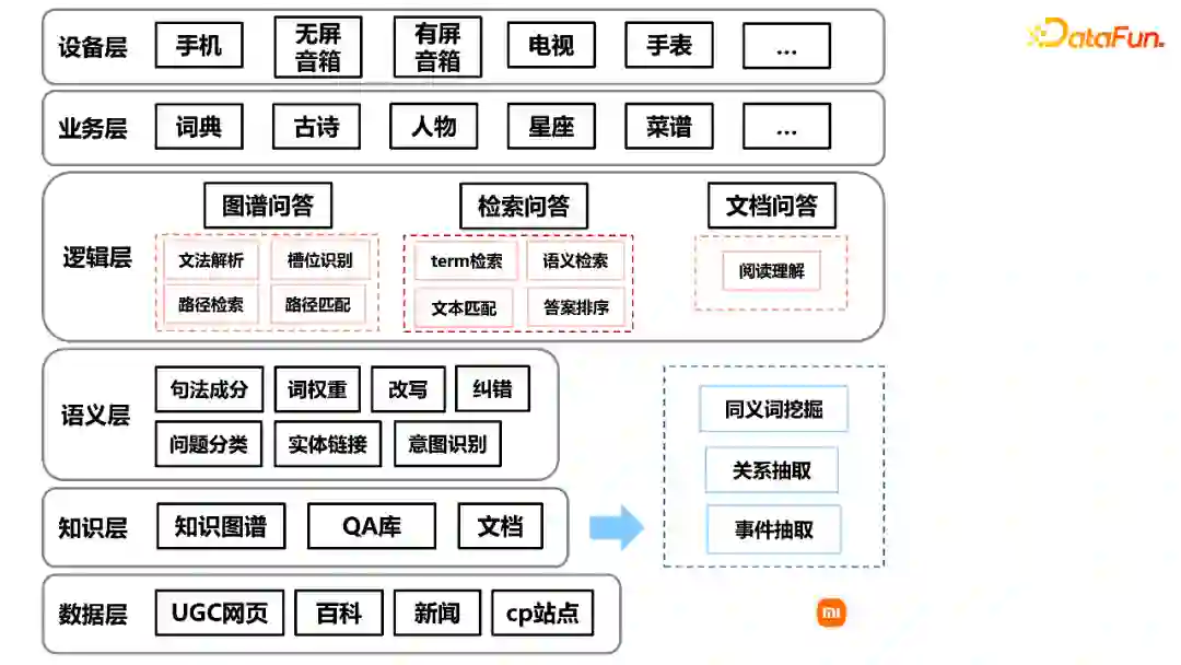 ,主要由数据层、知识层、语义层、逻辑层、业务层、设备层组成。在知识层,本文将分享信息抽取的相关工作。逻辑层主要包括图谱问答、检索问答和文档问答,今天主要分享图谱问答。在业务层,基于问答模块,可以在词典、古诗、人物、星座、菜谱等不同的功能垂域来进行业务层的开发。最后,针对不同的智能硬件,我们在设备层上进行相应的适配,来满足用户在不同终端的需求。