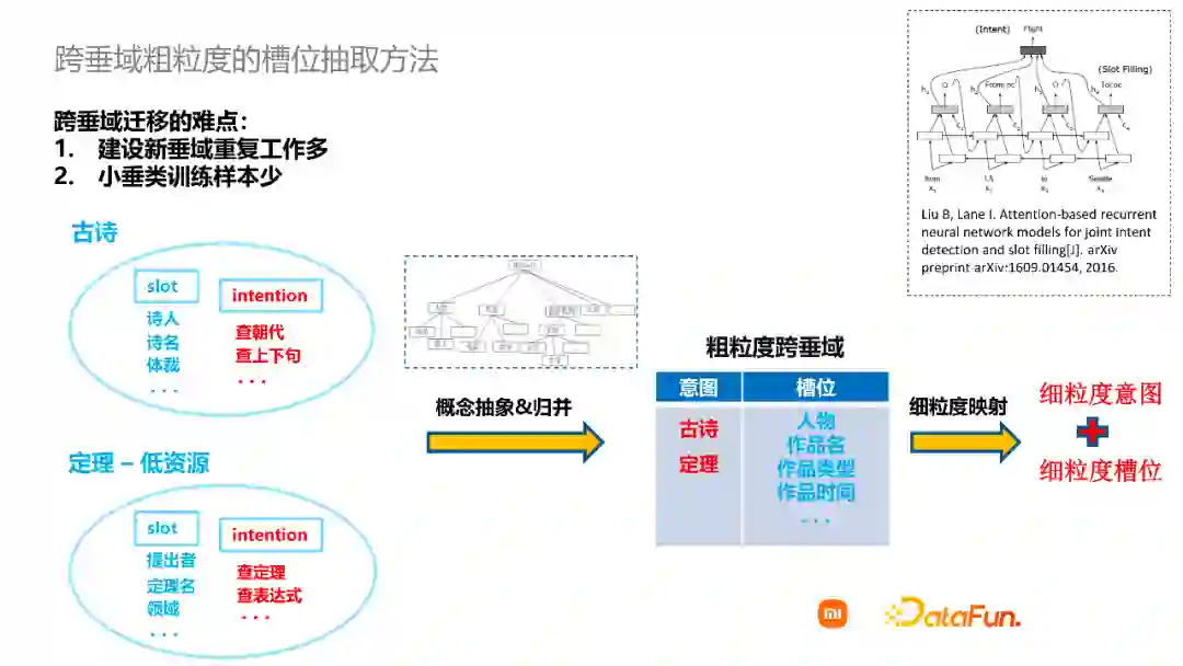 所以我们提出了一个跨垂域粗粒度的意图识别和槽位抽取方法。具体来说,是将不同垂域涉及到的槽位根据概念图谱来进行抽象,比如诗人和提出者都属于人物,那么我就可以将诗人和提出者定义为人物这样一个槽位。诗名和定理名,可以认为都是作品名。除了合并的槽位之外,各个垂域还有一些特有的槽位,我们将它们直接保留下来。与此同时,也把细粒度的意图直接上升到粗粒度的意图。这样就可以联合不同垂域的样本,训练一个跨垂域粗粒度的模型。在这种跨垂域的模型中,定理垂域就可以利用古诗垂域的训练样本,实现领域知识的迁移。
