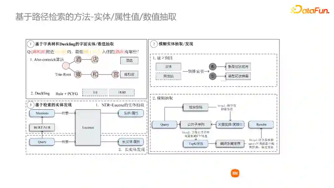 第一步我们需要从query当中找到这个问题涉及到的一些实体、属性值、数值,主要采用三类方式: