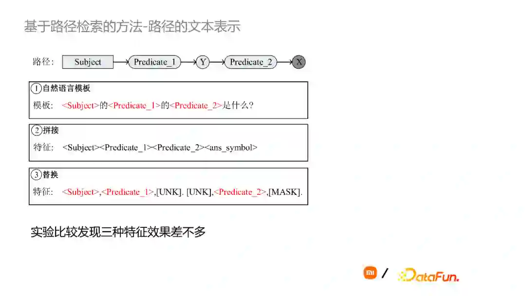下一步是路径匹配。需要在候选路径中找到最有可能的路径。具体方法为:将路径表达成文本的形式,把它建模成一个语义匹配的任务。路径的文本表示,这里介绍三种方式:第一种方式是设计一个模板将路径表示为一句话;第二种方式是把这个路径中的subject、predicate以及答案节点拼接起来;第三种方式和第二种方式相似,但是把中间节点通过[UNK]字符保留下来。通过实验对比,这三种方式的匹配效果差异不大。选择任意一种方式皆可。