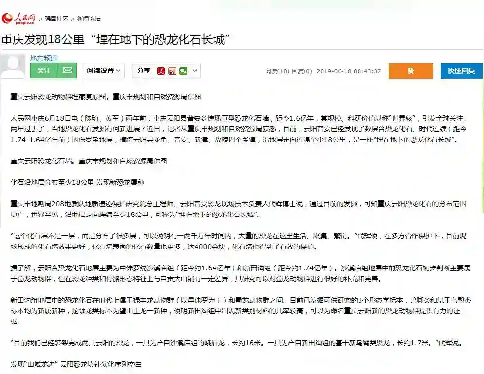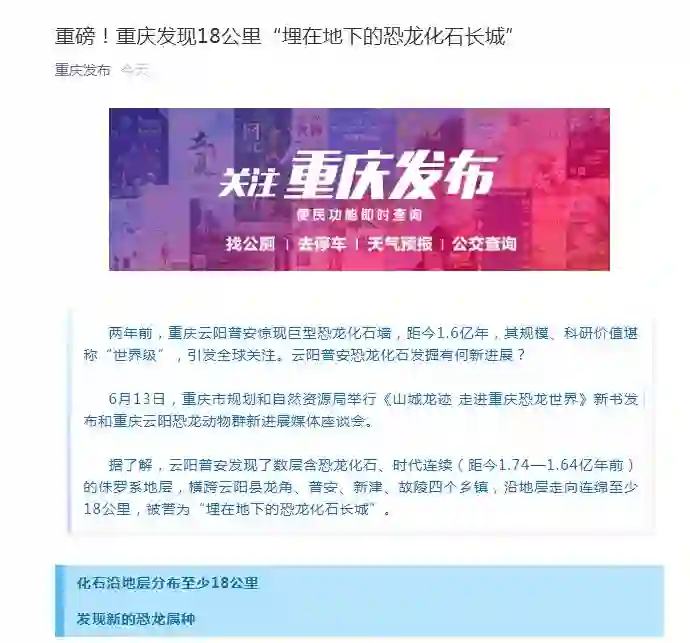6月13日,重庆市规划和自然资源局举行《山城龙迹 走进重庆恐龙世界》新书发布和重庆云阳恐龙动物群新进展媒体座谈会。新华社重庆站、新华网、人民网重庆发布、重庆日报、华龙网、上游新闻、重庆广播电台等多家媒体进行报道。