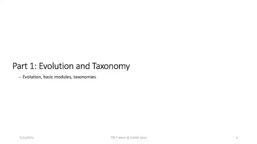 文本到语音(Text to speech, TTS)是人工智能领域的一个研究热点,已成为业界的一项重要产品服务。近年来,随着深度学习和人工智能的发展,基于神经网络的TTS技术大大提高了合成语音的质量。在本教程中,我们将介绍神经文本到语音,它由四个部分组成。在第一部分,我们将简要概述TTS技术的历史。在第二部分,我们将介绍神经TTS的关键组成部分,包括文本分析,声学模型和声码器。在第三部分中,我们将回顾推动TTS研究前沿和涵盖实用TTS产品的工作,包括端到端TTS、非自回归和轻量级TTS、鲁棒/表达/可控TTS、低资源TTS和自定义语音自适应。在本教程的最后,我们将描述TTS的几个挑战,并讨论未来的研究方向。