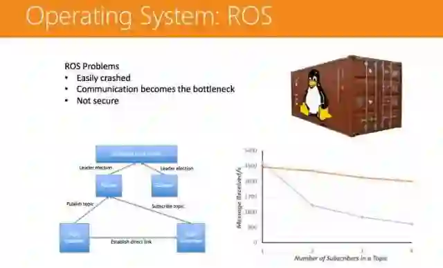 单一主节点,很容易整体崩溃。(解决方案:可以用 Zookeeper 机制来做,设置多个主节点。) 通信非常低效。(解决方案:可以用共享内存的方法来做。) 不是很安全,比如开一个恶意节点不断去损耗资源,很容易造成整体系统的崩溃。(解决方案:这个问题可以使用 Linux Container 的技术来解决。)硬件平台当然也是不可或缺的。其前端有很多传感器,信号传输进来后,有一个计算平台进行接收,处理完成后再通过 CAN-BUS,把控制信号传给车辆控制系统。