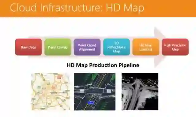 第二个是高精地图的制作。这是个很复杂的工作,首先是裸数据,然后从裸数据得出一个点云的数据,点云和点云之间要做一个对齐,对齐之后要把反射率的数据填到里面,然后再加一些语义的信息等。用分布式平台来做高精地图的生产,最大的计算量部分集中在点云的生产和对齐上,用异构计算可以很好地完成这些作业。
