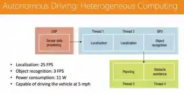 一年前我们探索过一个好玩的课题,如果用一个手机平台,是否可以支撑起无人驾驶的作业?于是我们使用手机平台,实现了一些比较简单的无人驾驶功能,主要是用视觉来做。下图显示了一个面向基于视觉的无人驾驶驾驶的移动 SoC 系统组成。在这个移动 SoC 实现中,我们利用 DSP 处理传感器数据,如特征提取和光流;我们使用 GPU 完成深度学习任务,如目标识别;采用两个 CPU 线程完成定位任务以实现车辆实时定位;我们使用一个 CPU 线程实现实时路径规划;使用另一个 CPU 线程进行避障操作。如果 CPU 尚未被全占有,多个 CPU 线程则可以在同一 CPU 核心上运行。