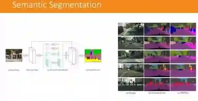 而在场景分类方面,运用深度学习的方法则使用的是另一种模型,被称为 PSPnet(语义分割)。这是金字塔型的场景分解模型,将一个场景不断地压缩,把类似的物体聚类,然后再做判断。