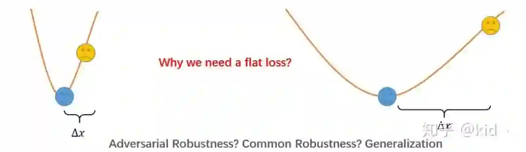 (蓝色笑脸)属于相同类,模型能将其分对的必要条件是损失不要过大,则此时“平坦”的损失能够满足这一条件,且泛化性会越好。