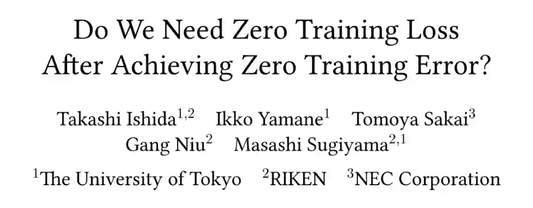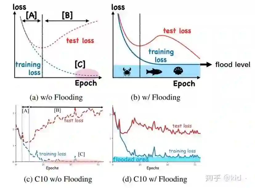 上图可以大致描述整篇文章干了一件啥事。先看左边一列,是一个正常的训练过程,对于阶段A,随着training loss的降低,test loss也会 跟着降低;但是到阶段B后,我们继续在训练集上训练,会让test loss上升。右边一列是本文提出的 flooding 方法,当training loss大于一个阈值(flood level)时,进行正常的梯度下降;当training loss低于阈值时,会反过来进行梯度上升,让training loss保持在一个阈值附近,让模型持续进行“random walk”,并期望模型能被优化到一个平坦的损失区域,这样发现test loss进行了double decent!一个简单的理解是,这和early stop类的方法类似,防止参数被优化到一个不好的极小值出不来。